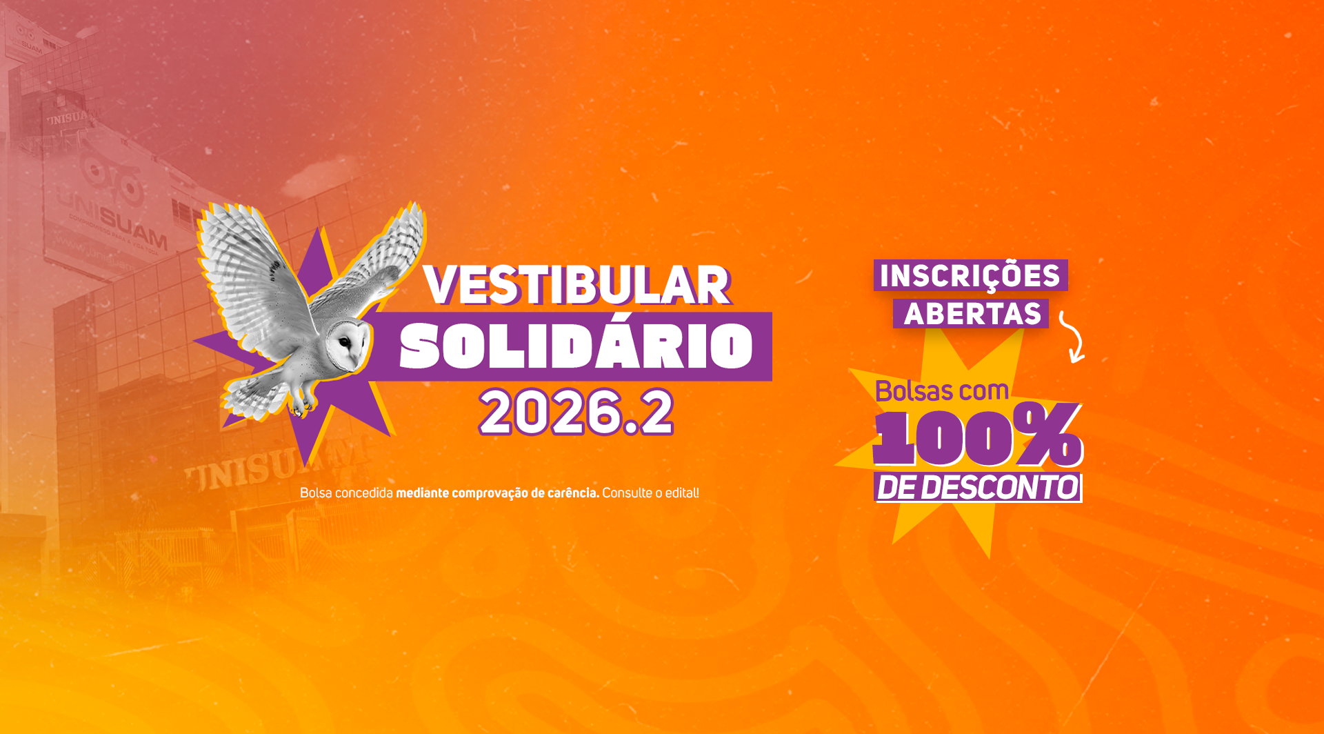 Se você sonha em ingressar no ensino superior, mas precisa de apoio financeiro para dar esse passo, essa é a sua chance. A UNISUAM está com inscrições abertas para o Vestibular Solidário 2026.2, uma oportunidade de conquistar uma bolsa de estudos 100% integral.